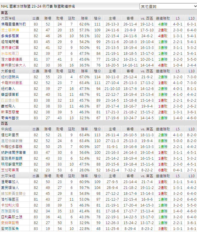 此次排名也是競爭激烈,我們來看勝率60%以上的隊伍就有七支,分別是佛羅里達美洲豹/紐約遊騎兵/卡羅萊納颶風/達拉斯星辰/溫尼伯噴射機/科羅拉多雪崩/溫哥華加人。